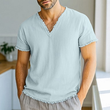 Męskie Koszulka Koszulka lniana Krótkie rękawy W serek Lato Równina Moda Designerskie Podstawowy Miękkie Raw Edge Plaża Urlop Codzienne Różowy Biały Jasnoniebieski Top Tee dla mężczyzn