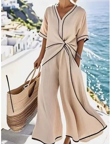Damskie Kombinezon Aktywny Prążki Krótki rękaw Spodnie szerokie nogawki W serek Kieszeń Codzienny Urlop Regularny Morelowy Lato