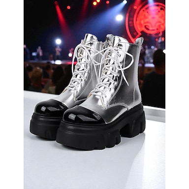Damskie srebrne metaliczne buty na platformie z grubymi obcasami i zamkiem błyskawicznym – styl disco z lat 80., modne obuwie imprezowe na wieczorne wyjścia i imprezy taneczne