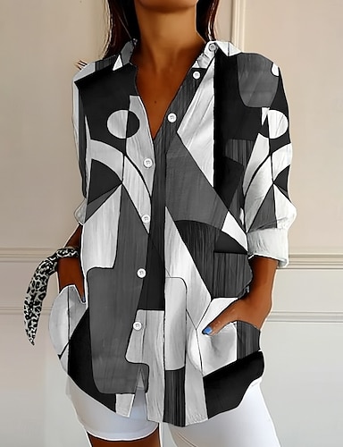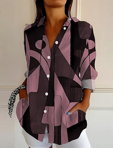 Bluzka damska z lnu oddychająca lekka graficzny geometryczny blok kolorów vintage tropikalna hawajska regularne bluzki codzienna urlopowa plażowa patchworkowe guziki nadruk w różowym zielonym lato