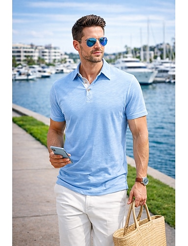 męskie koszulki polo bawełniane bambusowe, golfowe, casualowe, do pracy, z klapami, kołnierzykiem polo, krótkim rękawem, podstawowe, nowoczesne, w jednolitym kolorze, patchworkowe, guziki, letnie,