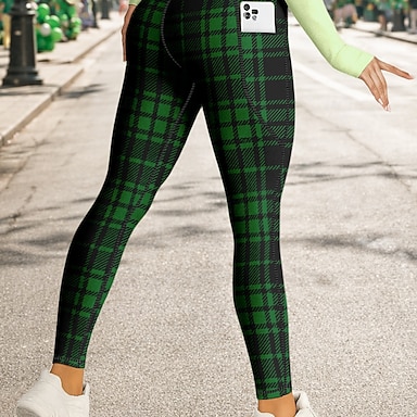 Św. Patryk Damskie legginsy do pilatesu Spodnie fitness Legginsy na siłownie Kieszenie Opłata skarbowa Boczne kieszenie Pilates Siłownia Trening w siłowni Majtki Rajstopy Getry Kratka Zielony Sport