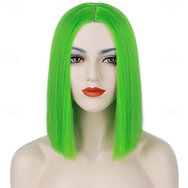 Zielone peruki bob dla kobiet krótka peruka bob z grzywką 14 cali proste peruki miękkie syntetyczne pełne peruki na co dzień imprezy peruki na Dzień Świętego Patryka peruki Halloween