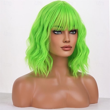 zielone peruki dla kobiet 12'' krótka zielona peruka bob z grzywką naturalna syntetyczna miękka peruka urocze kolorowe peruki na imprezę z okazji dnia św. patryka halloween peruki na dzień św. patryka