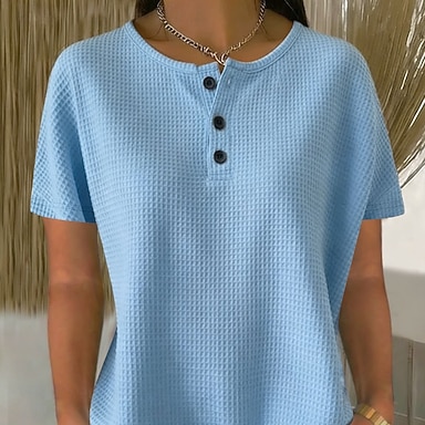 Damskie Oversize Koszulka z goframi Koszulka Opuść ramię Guziki na klatce piersiowej Elegancki Codzienny Krótki rękaw W serek Zwykłe topy Codzienny Wyjściowe Czarny Biały Rumiany róż Błękit nieba