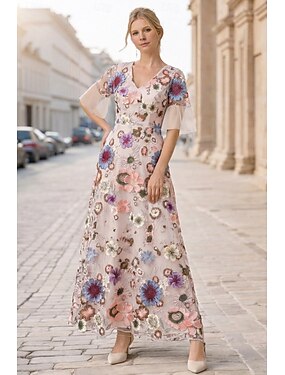 A-Line Dress Floor Length Maxi Dress Party Dress Cocktail Dress Mother of the Bride Dress Short Sleeve V Neck Elegant Vintage Luxurious Formal Wedding Guest Kentucky Derby Chiffon Tulle with Floral