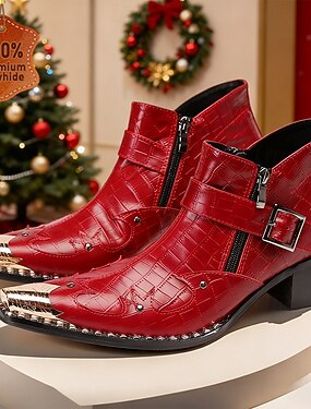 Men's Red Crocodile-Patterned Leather Boots with Silver Accent – Sophisticated Christmas Footwear for Holiday Festivities