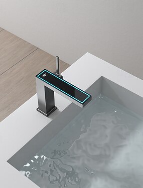 Bathroom Faucet LED Waterfall Spout 3 Color Changes with Temperature, Sink Mixer Mono Basin Taps, Single Handle One Hole Brass Washroom Vessel Tap Deck Mounted
