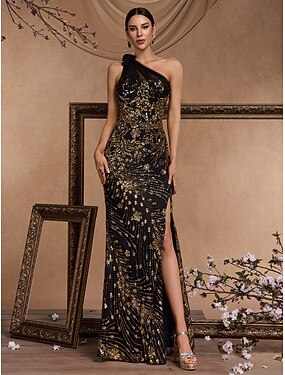 A-Line Floor Length Ankle Length Cocktail Dresses Prom Dresses Evening Gown Ball Gown Elegant Glittering High Split Sleeveless One Shoulder Formal Wedding Sequined with Glitter Sequin