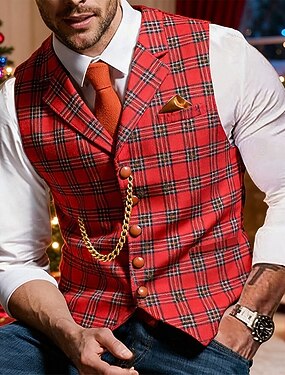 Men's Vest Waistcoat Gilet Formal Christmas Outdoor Vacation Fashion Streetwear Spring Fall Buttons Polyester Plaid Single Breasted V Neck Tailored Fit Red Vest
