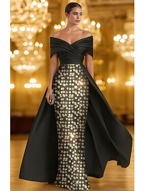 Sheath / Column Floor Length Evening Gown Ball Gown with Overskirt Formal Dress Elegant Glittering Silky Short Sleeve Off Shoulder Formal Wedding Detachable Satin Lace with Glitter Beading Sequin