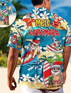 Christmas Men's Funny Christmas Printed Shirts Santa Claus Beach Party Hawaiian Casual Outdoor Street Fall Turndown Short Sleeve Blue S M L Shirt