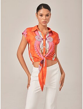 Summer Cuban Collar Tie-front Cropped Loose-fitting Floral Top