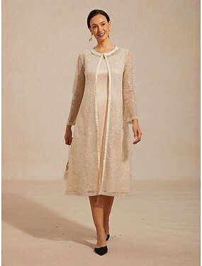 Two Piece Sheath Column Knee Length Wedding Guest Dress Mother of the Bride Dress 3/4 Length Sleeve Jewel Neck Elegant Formal Wedding Guest Church Chiffon Lace Wrap Included Jacket Dresses with