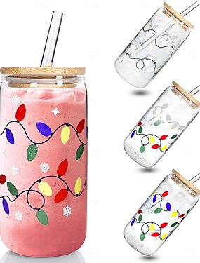 Color Changing Christmas Cup, Cute Color Changing Glass Cup, Bamboo Leakproof Lid & Steel Straw, Reusable Travel Mug for Iced Coffee, Smoothie, Cocktail, Xmas Party Decoration Gift Tumbler