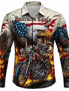 Men's Hellfire Flames American US Flag Eagle Shirt Button Up Shirt Long Sleeve Vintage Retro Outdoor Casual Holiday Spring Fall Turndown 3D Print Collared Shirts Khaki Beige