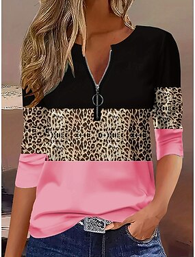 Women's T Shirt Graphic Leopard Color Block Vintage Stylish Classic Long Sleeve Round Neck Regular Tops Daily Weekend Zipper Print Blue White Pink Purple Green Spring Fall Winter