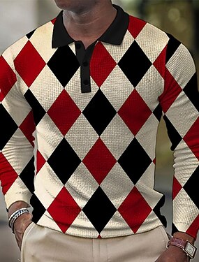 Men's Plaid Waffle Polo Shirts Golf Shirt Long Sleeve Polo Shirts Collared Shirts Vintage Casual Vacation Wear Formal Wear Festival Wear Buttons 3D Print Spring Fall Winter Multi Color