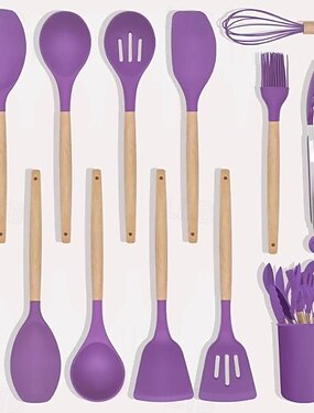 12 Piece Silicone Cooking Utensils Set Non-Stick Cutlery Set Food Grade Silicone Kitchenware Wooden Handle Baking Tools Baking Cooking Small Cookware Set for Apartment Home