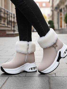 Women's Beige Faux Fur Lined Platform Ankle Boots with Wedge Heels - Warm and Stylish Winter Footwear