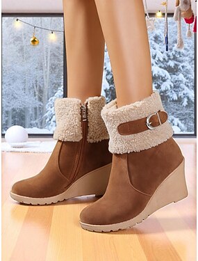 Women's Fuzzy Cuffed Wedge Boots, Brown Suede with Zipper and Buckle Detail, Warm and Cozy Winter Boots for Cold Weather, Casual Outings and Holiday Celebrations