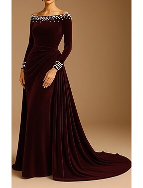 A-Line Sheath / Column Sweep / Brush Train Evening Gown Ball Gown with Overskirt Formal Dress Elegant Glittering Celebrity Style Long Sleeve Off Shoulder Formal Wedding Satin Stretch Satin with