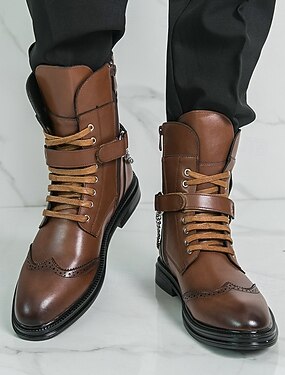 Men's Brown Lace-Up Boots with Straps - Stylish and Durable Faux Leather, Perfect for Fall and Winter, Ideal for Casual and Semi-Formal Outfits, Outdoor Activities and Street Style