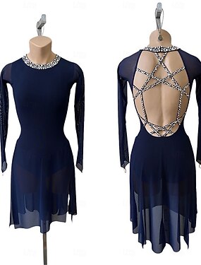Figure Skating Dress Women's Girls' Ice Skating Dress Blue Black Patchwork Open Back Mesh Spandex High Elasticity Training Competition Skating Wear Classic Crystal / Rhinestone Long Sleeve Ice