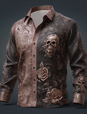 Men's Skull Floral Print Day of the Dead Shirt Button Up Shirt Long Sleeve Vintage Retro Dark Gothic Style Outdoor Holiday Spring Fall Turndown 3D Print Linen Like Shirt Brown