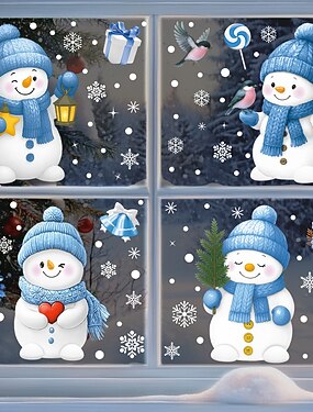4 Sheets Christmas Window Cling Wall Sticker Decals Decorations, Candy, Snowflakes, Gift Boxes & Snowmen, Static Cling, Storefront & Home Glass Decor