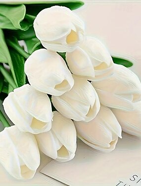 10pcs Realistic White Tulip Artificial Flowers with Lush Green Leaves – Durable PU Material for Weddings, Engagements, and Home Decor – Battery-Free Wedding Floral Arrangement