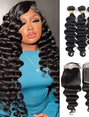 Brazilian Human Hair Loose Deep Human Hair Weave Extension 3 Bundles With Closure 4x4 Lace Closure hair