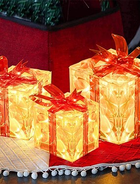 Set of 3 Christmas 60 LED Lighted Gift Boxes Transparent Warm White Lighted Christmas Box Decrations Presents Boxs with Red Bows for Christams Tree Yard Home Christams Decorations