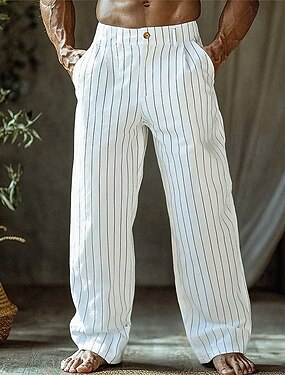 Men's Linen Pants Trousers Summer Pants Beach Pants Pocket Straight Leg Striped Comfort Breathable Vacation Daily Holiday Hawaiian Boho Black White