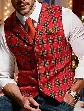 Men's Vest Waistcoat Gilet Christmas Outdoor Vacation Party Fashion Streetwear Spring Fall Buttons Polyester Breathability Plaid Single Breasted V Neck Tailored Fit Red Vest