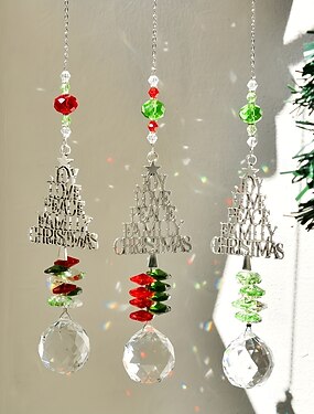 Crystal Sun Catcher Christmas Tree Ornament - "JOY HUMBLE FAMILY CHRISTMAS" Inscription, Festive Red & Green Beads, Ideal for Home & Garden Window Decor, Perfect Holiday Gift, Outdoor Christmas Decor