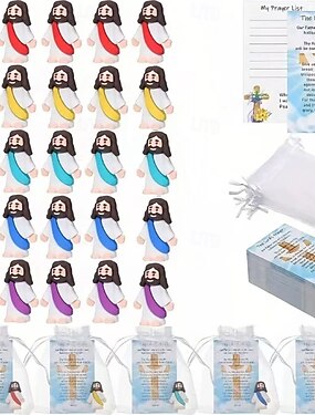 A set of 20 Sunday school Christian church party gifts for Little Jesus includes 20 mini Jesus statues 20 prayer scripture cards and 20 organza bags in multiple colors