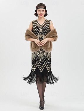 Set Retro Vintage Roaring 20s 1920s Knee Length Flapper Dress Fancy Costume Faux Fur Shawl with Accessories Sleeveless The Great Gatsby Flapper Girl Sequins Tassel Fringe V Neck Fancy Dress Women's