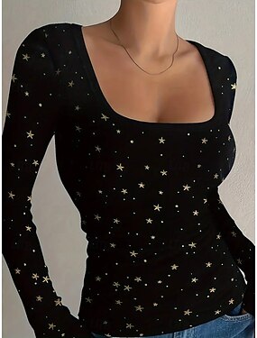 Women's Blouse Star Stylish Casual Long Sleeve U Neck Regular Tops Daily Print Black Spring Fall Winter