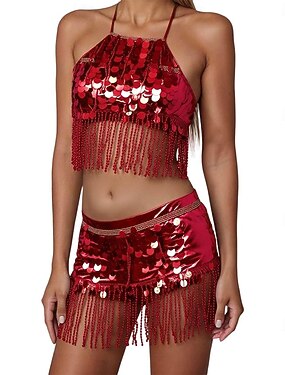 Samba Dancewear Women's 2 Piece Sequin Belly Dance Skirt Set Fringe Hip Scarf with Halter Bra Topsl Performance Costume