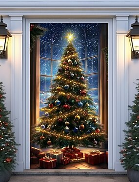 Christmas Door Decorations Door Covers Xmas Tree Door Tapestry Door Curtain Decoration Backdrop Door Banner for Front Door Farmhouse Christmas Holiday Party Decor Supplies Gift Indoor/Outdoor