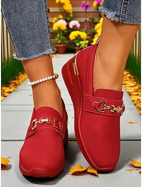 Women's Red Slip-On Loafers – Comfy Wedge Shoes with Gold Chain Detail for Walking, Shopping and Fall Fashion Outfits