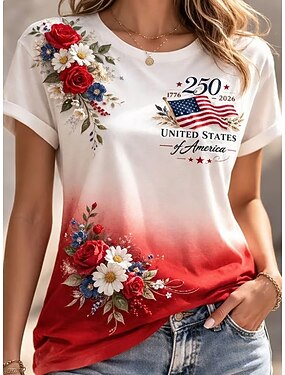 Camiseta patriótica feminina do Dia da Independência 250ª Aniversário Americano impressão gráfica bandeira bandeira americana vintage estilosa clássica manga curta gola em V tops regulares impressão