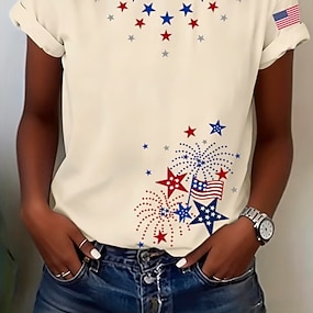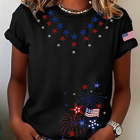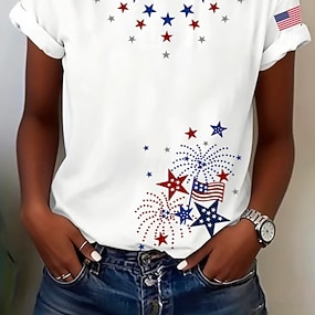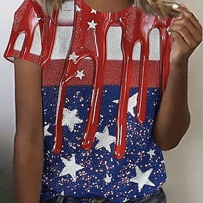 Dia da Independência Americana Mulheres Camiseta Imprimir Gráfico Bandeira à moda Clássico Casual Manga Curta Gola Redonda Tops regulares Diário Azul Preto Branco Vermelho Verão Primavera