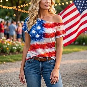 Dia da Independência Americana Mulheres Camiseta T-shirt Imprimir Gráfico Bandeira americana Moda à moda Clássico Manga Curta Assimétrico Tops regulares Diário Para Noite Final de semana Vermelho