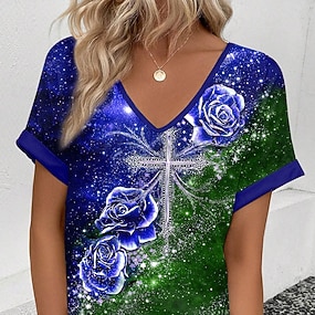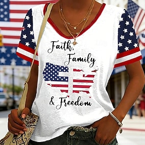 Dia da Independência Camiseta Patriótica Feminina Impressão Gráfica Bandeira Vintage Estilosa Clássica Manga Curta Decote em V Tops Regulares Dia a Dia Azul Preto Vermelho Verde Verão Primavera