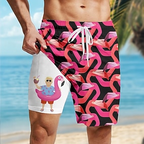 Homens Flamingo Coqueiro Shorts Forrados Shorts de Natação 2 em 1 Calção de Banho Cintura Média Havaiana Férias Roupa de Praia Bolsos laterais Com forro de compressão Cintura elástica com cordão