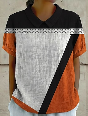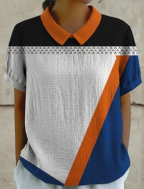 Blusa feminina com botões, estampa geométrica boêmia, estilo férias, manga curta, tecido texturizado, gola de camisa, blusas regulares para uso diário, ocasiões especiais, verão e primavera. Cor