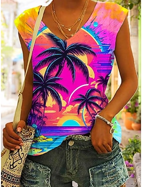 Camiseta Regata Feminina Folha Estilosa Casual Sem Mangas Alças Tops Regulares Diário Estampa Rosa Verão