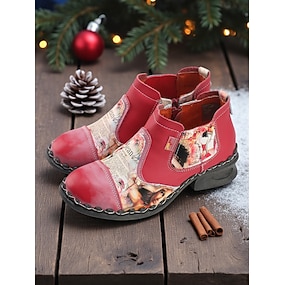 Botas femininas de couro legítimo vermelhas feitas à mão com patchwork de estampa artística, botas chelsea casuais confortáveis estilo vintage para o natal, roupas de inverno &reuniões de férias